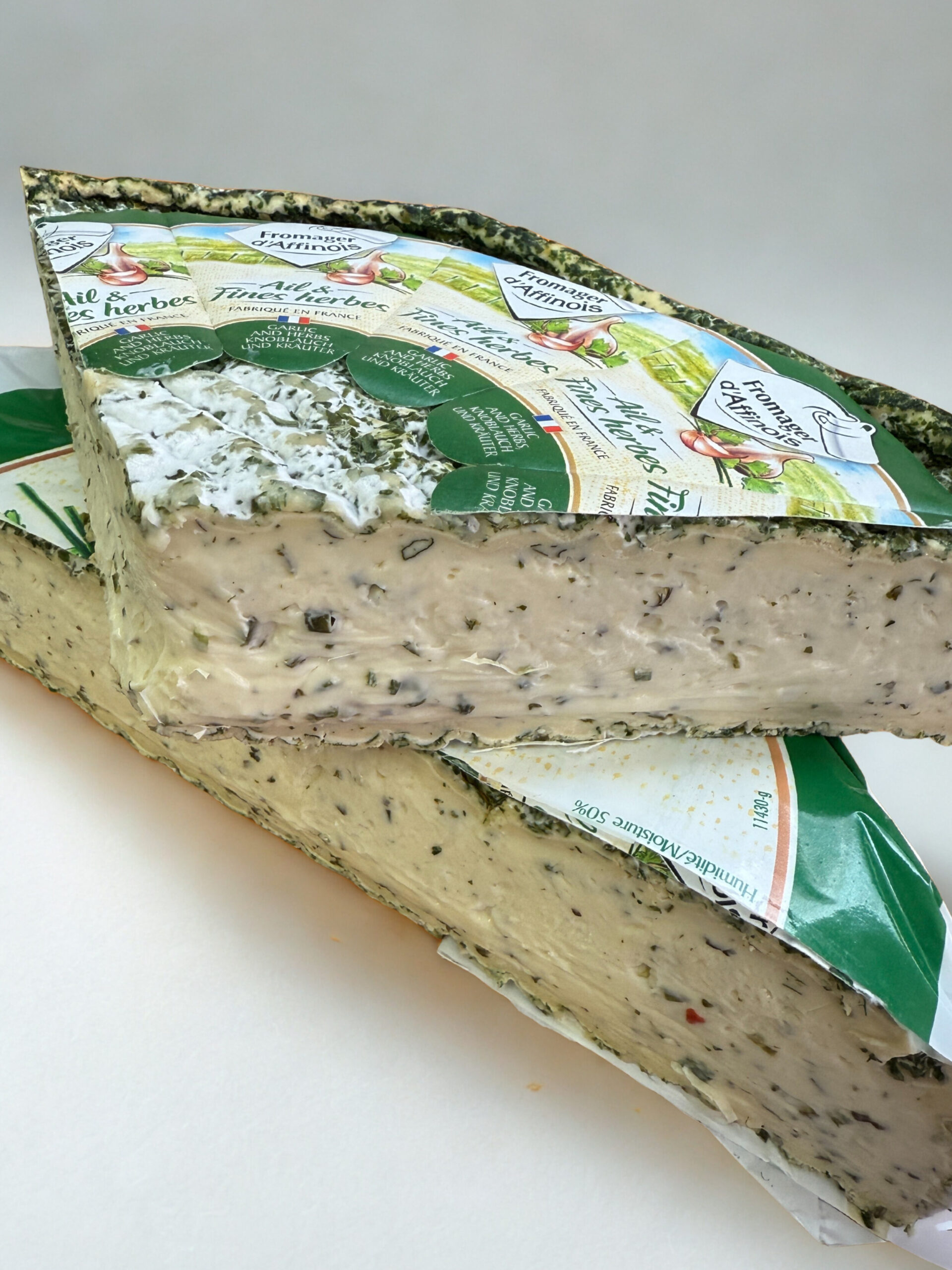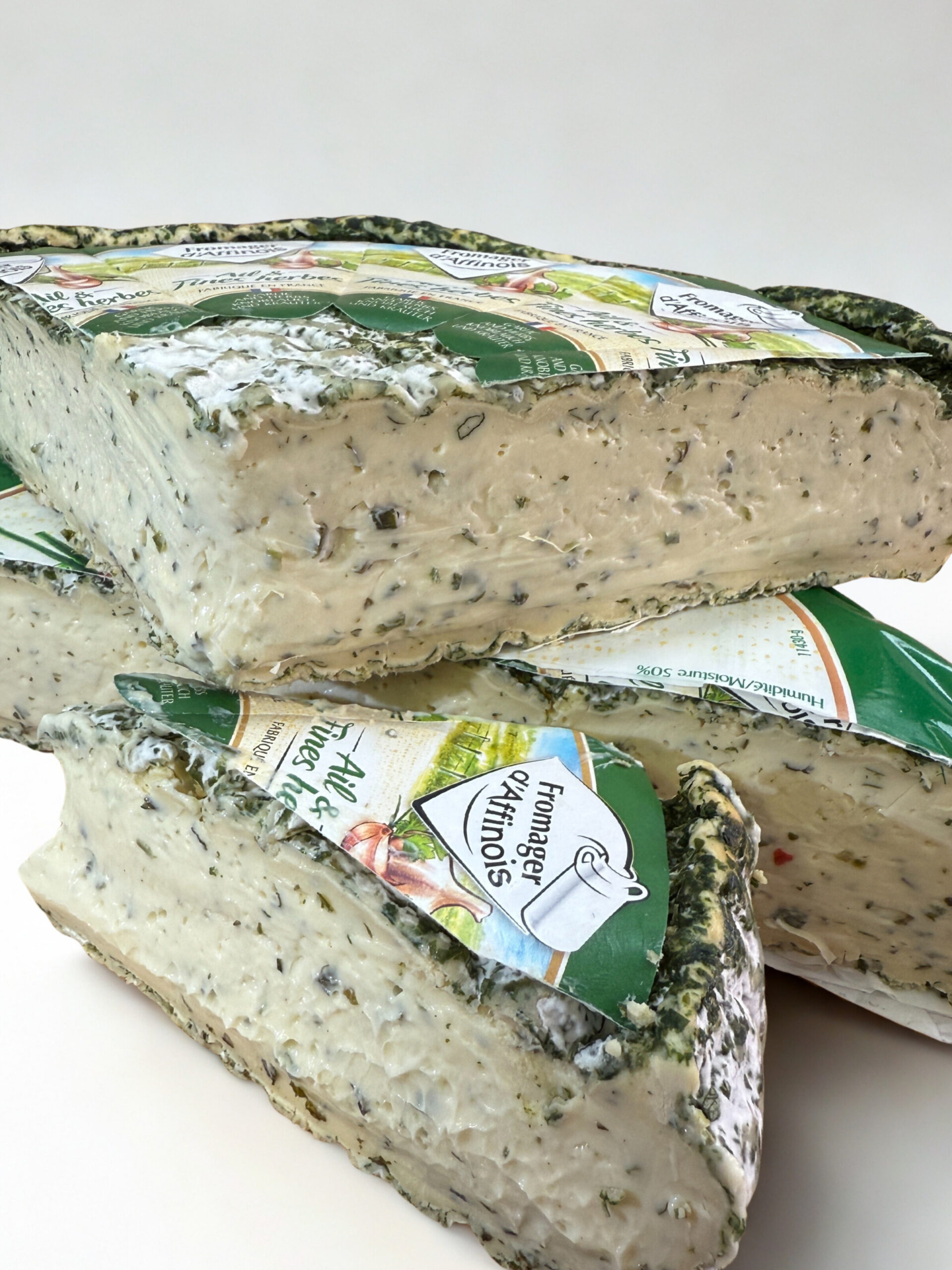Francuski ser Fromager d’affinois z dodatkiem czosnku i ziół podwójnie kremowy typu Brie- to wyjątkowy, miękki ser z pasteryzowanego mleka krowiego, zaliczany do kategorii double crème. Pochodzi z Francji i zachwyca niezwykle kremową, jedwabistą konsystencją oraz delikatnym, lekko słodkawym smakiem, który przypomina najlepsze sery potrójnie śmietankowe (triple crème), choć zawartość tłuszczu jest nieco niższa.