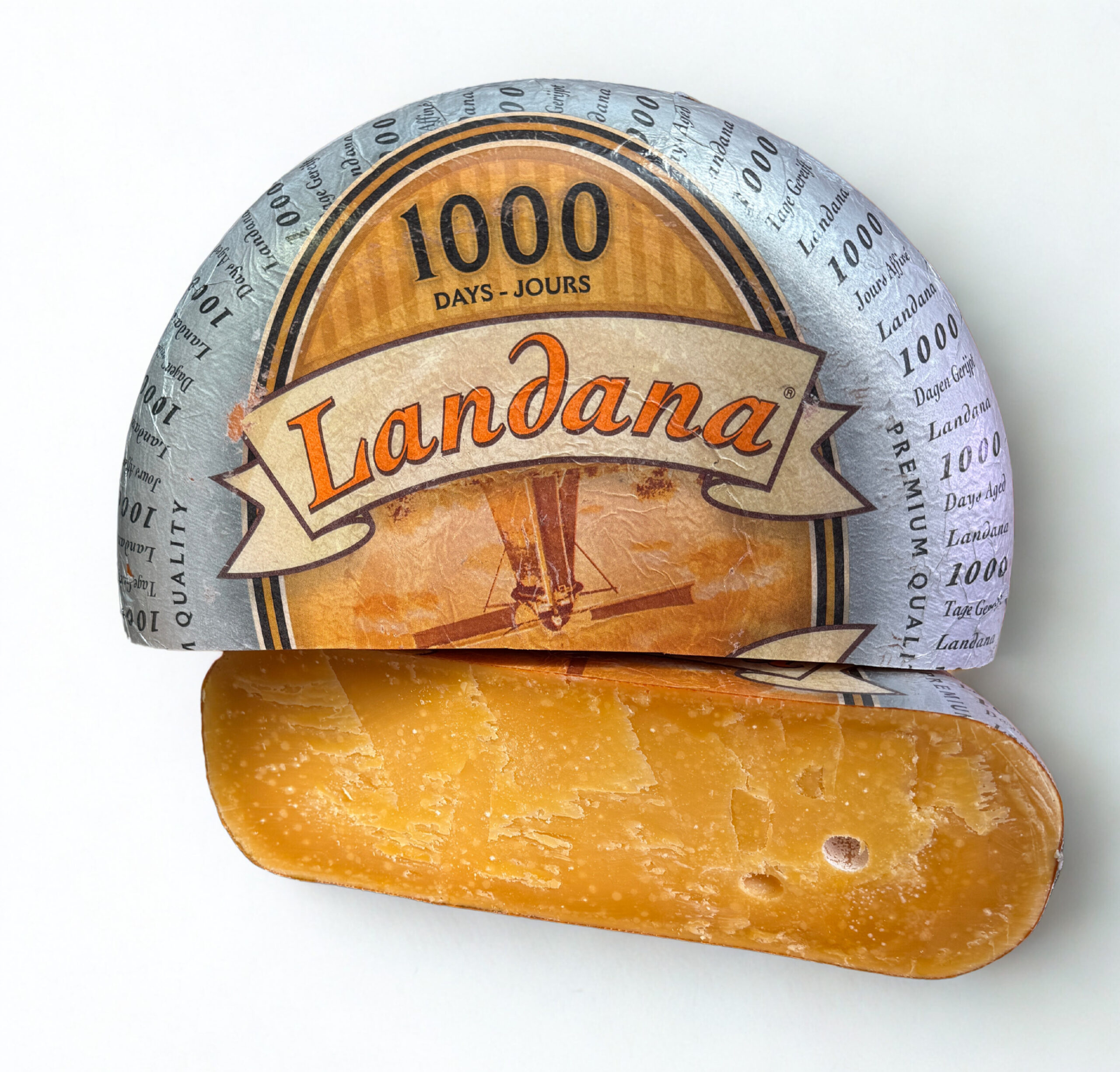 To perła w koronie holenderskich serów. Jest wytwarzana wyłącznie z najlepszego, starannie wyselekcjonowanego mleka krowiego. Ser o pełnym, dojrzałym smaku. Dojrzewa naturalnie przez 1000 dni. Podczas procesu dojrzewania ser jest poddawany obróbce i obracany z najwyższą starannością przez mistrza sera. Pobierane są próbki, a ser jest regularnie sprawdzany, aby sprawdzić, czy dojrzewa zgodnie z planem. Ser ma ciepły, złocisty kolor, zbliżony do koloru karmelu. Małe białe plamki na serze to drobne kryształki minerałów i białek, które są widocznymi oznakami jego mistrzowskiego dojrzewania. Jego konsystencja jest zwarta, lekko kruszy się podczas krojenia. Landana 1000 Dni jest idealna na każdą deskę serów oraz w towarzystwie wina uzupełniającego, takiego jak orzeźwiający Sancerre lub fermentowane w beczkach Barolo. Grubo płatkowana lub pokrojona w drobną kostkę, ser jest również znakomita w sałatkach. Dzięki intensywnemu smakowi ser ten nadaje wielu potrawom wyjątkowego smaku.