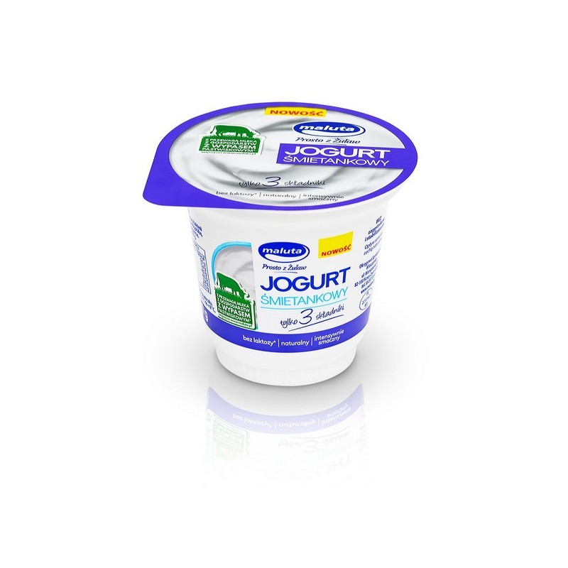 Jogurt śmietankowy z czystą etykietą „tylko trzy składniki” bez dodatku żadnych stabilizatorów,emulgatorów czy konserwantów. Jest to produkt ,aromatyczny, łagodny, lekko kwaśny, intensywnie smaczny, o aksamitnej konsystencji. Jogurt śmietankowy otrzymuje się przez ukwaszenie szczepami bakterii jogurtowych mleka wzbogaconego śmietanką. Jogurt ten nie zawiera laktozy.